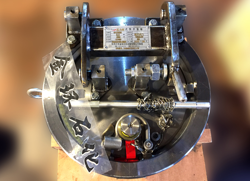 快開(kāi)盲板是用于壓力管道或壓力容器的圓形開(kāi)口上的一種機(jī)械裝置。一般由筒體法蘭、頭蓋、勾圈或卡箍、密封圈、安全聯(lián)鎖機(jī)構(gòu)、開(kāi)閉機(jī)構(gòu)、轉(zhuǎn)臂及短節(jié)(需要時(shí))等部件構(gòu)成。